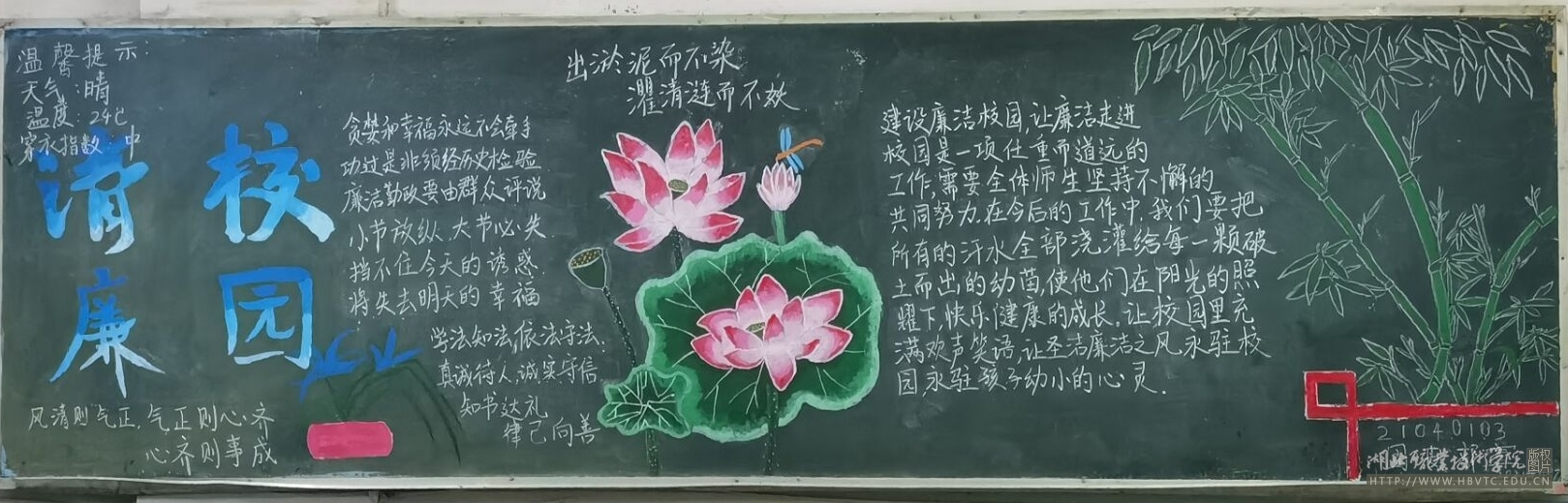 本次板报绚丽多姿,几笔勾勒似云锦,点墨绘出心中情。通过板报的方式传达出了本次活动的主题,让学生们通过画面感受到清廉的最深层含义,同时也为清廉校园起到了积极地教育宣传作用。