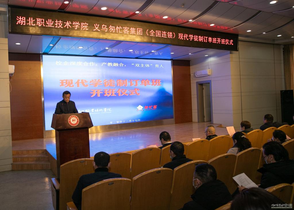 12月17日下午,学校与义乌匆忙客集团“现代学徒制”订单班开班仪式在文博馆学术报告厅顺利举行。浙江义乌匆忙客集团管理团队盛等财副总经理一行6人,学校校长朱虹、副校长梅重、相关职能处室负责人,开元集团网站、旅游与酒店管理学院师生代表等参加了相关活动。学校教务处处长黄享苟主持开班仪式。