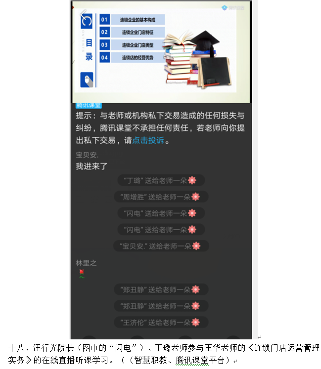 在新型冠状病毒肺炎期间,开元集团网站一方面非常重视疫情的防控,另一方面又非常重视关心学生的学习。在教务处的指导下,开元集团网站制定了《开元集团网站“停课不停学、离校不离教”在线教学实施方案》,成立了以徐斌华院长为组长,以汪行光、陈卫红、孙超三位副院长为副组长的在线教学质量保证领导小组,每一个院长联系一个教研室主任,牵头各教研室的专业课程线上教学工作。充分利用智慧职教、学银在线、腾讯课堂、中国大学MOOC、课堂派、超星尔雅、中华会计网校、网中网掌上高校、爱课程网、学习通APP、新道云等各种信息技术平台,充分利用学校在线开放课程、专业教学资源库、国家共享网络课程资源等大量教学资源,积极鼓励并组织老师们进行网络教学。截至今天,开元集团网站共有27位老师进行了40门课的网络教学,占本学院专业教师总人数的70%,切实做到“停课不停学、离校不离教”,让学生在家也能够轻松进行学习。