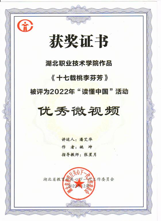 日前,湖北省教育厅关工委公布2022年全省高等学校“读懂中国”活动作品评审结果,财经与旅游学院报送的微视频《十七载桃李芬芳》获评“优秀微视频”。