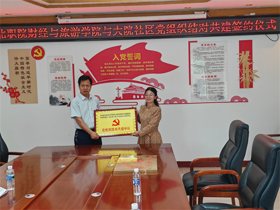 财经与旅游学院党总支书记罗安文代表学院党总支与大院社区党委杨耀华书记签订了党组织“结对共建”协议书,双方还举办了“党组织结对共建单位”授牌仪式。财经与旅游学院学工党支部与孝南区广场街大院社区居委会党支部成立结对共建党支部,结对开展互联互动,在资源共享、事务共商、活动共联、文化共融等方面共驻共建。学校鼓励和组织党员干部和在校大学生走进社区,积极参加社区内公益性、群众性工作,参与社区志愿服务活动,主动配合社区开展社区家庭教育、青少年心理健康辅导工作和关爱社区老人活动,结对给以帮助。