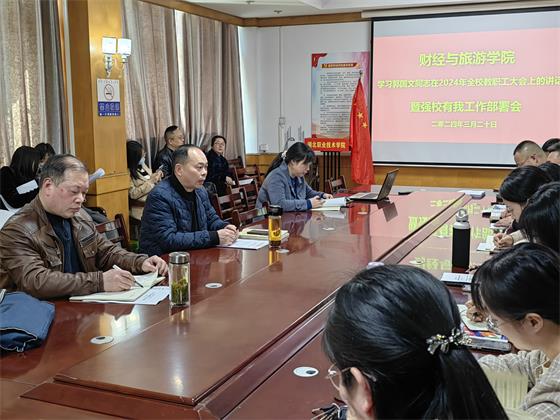 财经与旅游学院于3月20日下午在文华楼201会议室组织开展了“学习郭书记在2024年全校教工大会上的讲话暨强校有我工作部署”主题活动。学院全体教师参加了会议,会议由财经与旅游学院长徐斌华主持。