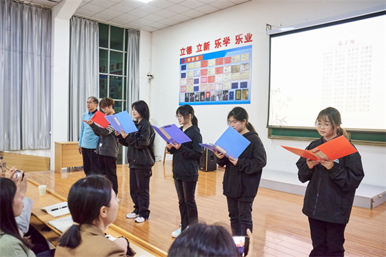 在古朴典雅的音乐声中,罗安文书记介绍国学的智慧和魅力,并宣布我院国学课堂正式启动。他嘱托学子通过学国学成为善良博爱,乐观豁达,自信勇敢的时代新青年;陈卫红副院长宣读国学教育方案,对学院国学教育活动进行部署和安排;拜师仪式中,王水华教授对学生代表进行衣冠整理,并进行亲切地问候;五位学生代表朗诵《弟子规》,两位老师代表朗诵《朱子治家格言》,让全场沉浸在国学的无限魅力当中;王水华老师对《弟子规》进行了深入解读,结合现代社会实际,在与学生的互动中详细阐述了《弟子规》中关于孝道、礼仪、学习和处世的智慧,使师生们对国学经典著作有了更加全面和深刻的理解。最后,全体学生齐读《大学》为此次活动拉上了帷幕。