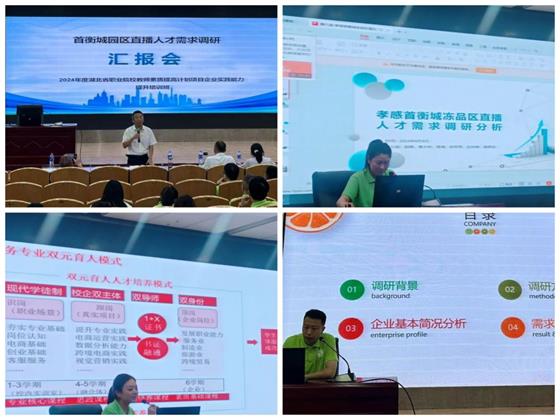 会议最后,60名国培学员分成10个小组在首衡城项目公司工作人员的协助下,分赴园区果蔬、水产等市场展开实地调研活动,通过问卷调查、深度访谈、现场观察等方式收集关于网络营销和电商直播人才需求的第一手资料,深入了解企业运营情况,并经过紧张而有序的数据整理、分析与讨论,形成了高质量的调研报告。在汇报展示环节,各小组代表轮流上台,以PPT、图表等形式生动展示了调研成果,深入浅出地剖析了首衡城园区网络营销专业人才供需状况、岗位设置情况及素质能力要求等,并提出了针对性的意见与建议,充分展现了学员们的专业素养和创新能力。整场汇报紧凑而精彩,赢得了阵阵掌声。