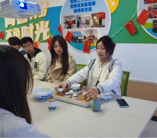 同学们积极参与体验,在实践中亲手泡茶、奉茶,见证了茶叶在水中舒展、茶汤逐渐金黄透亮的奇妙变化,也体悟到泡茶时专注当下的心境。在郭柯颖同学的耐心指导下,同学们认真学习温杯、置茶、冲泡、奉茶等步骤,一招一式都学得有模有样,专注于每一个细节,力求将茶汤的色香味展现到最佳状态。小小的一杯茶,已然超越饮品范畴,成为同学们修身养性、提升文化素养的独特媒介。