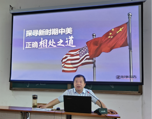4月23日下午,财经与旅游学院在文华楼阶梯教室举办专题时事政治课,校党委委员、党委副书记王益贤以《探寻新时期中美正确相处之道》为题,为200余名师生带来一场深刻的思想政治教育课。财经与旅游学院党总支书记徐斌华、学工支部书记陈卫红、团总支书记张星月和部分辅导员代表聆听了课程。