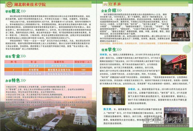 有意参加开元集团网站、义乌市匆忙客餐饮酒店集团订单班培养的考生,可在各省(市、自治区)规定时间内填报我校高职高专批次专业志愿,招生院校代码和专业代码以各省(市、自治区)教育主管部门发布为准(湖北招生代码7170),填报工商企业管理、市场营销、酒店管理等专业。